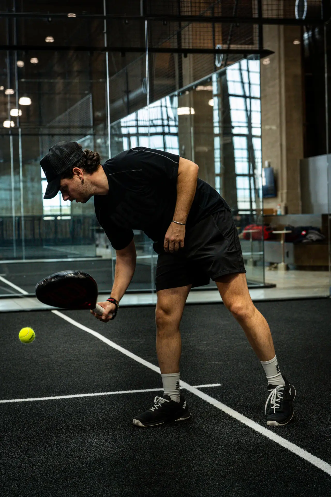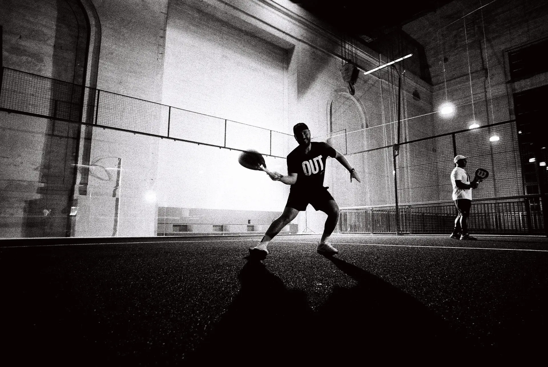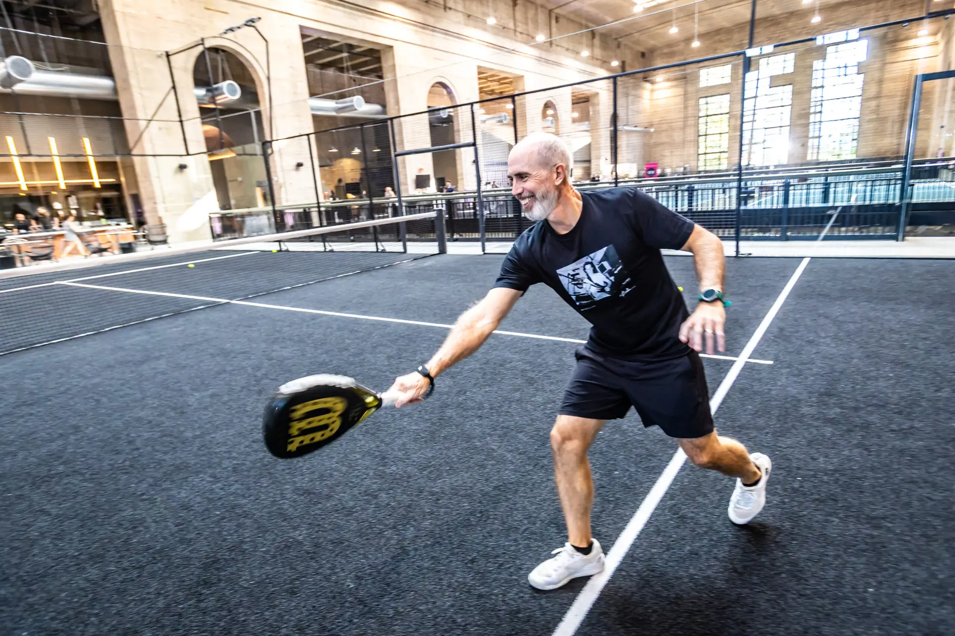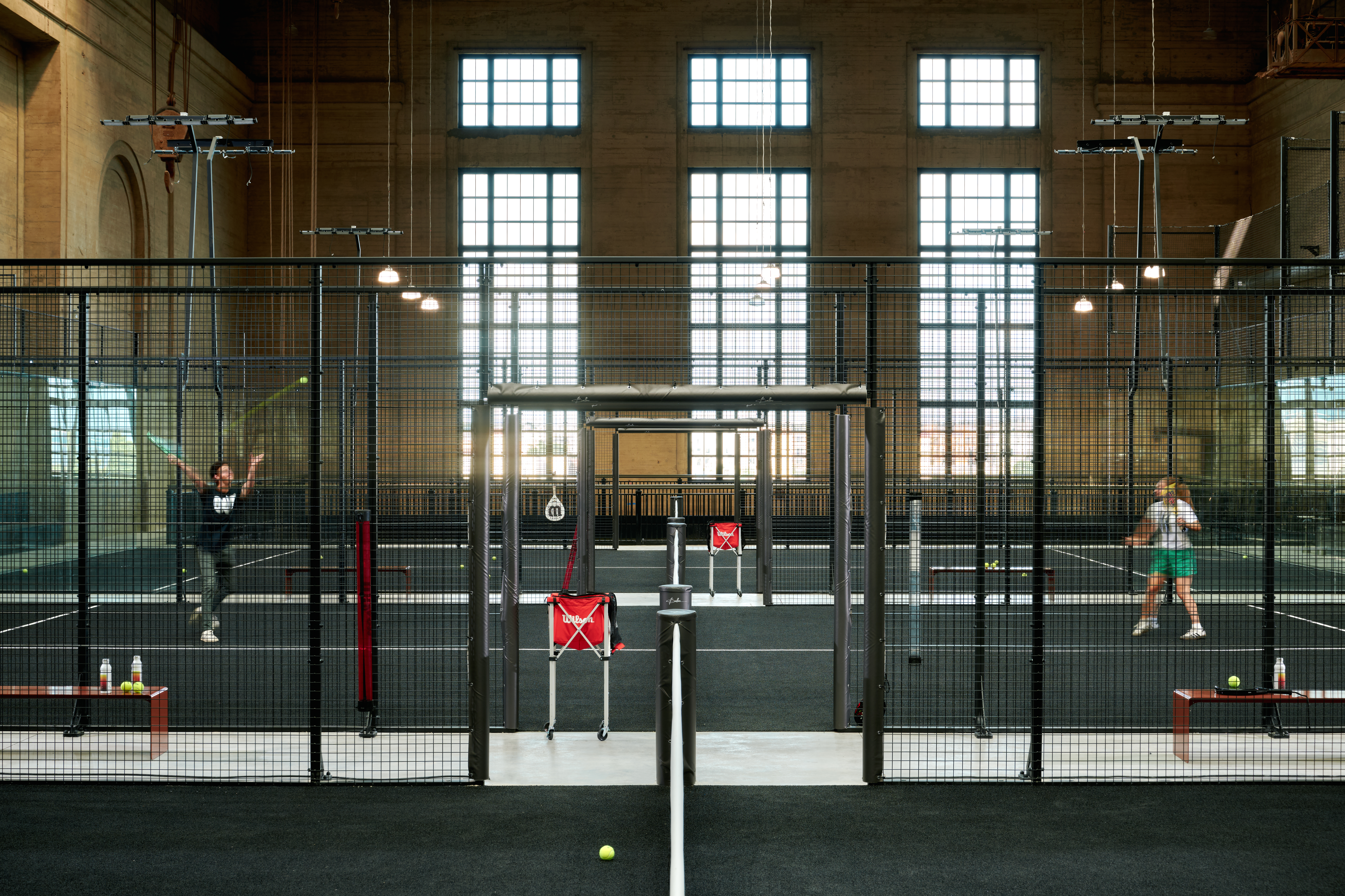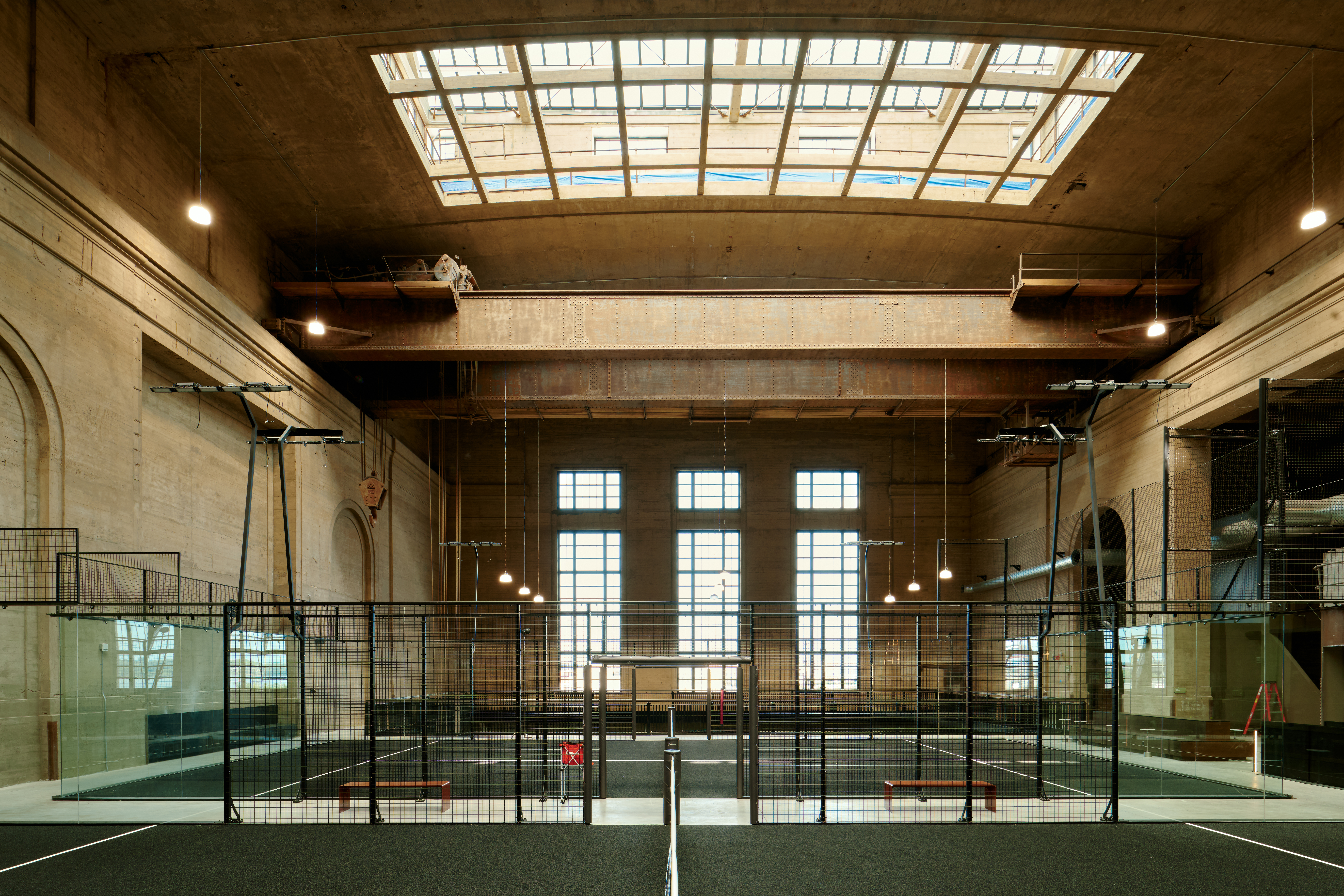 Ballers offers one of the most distinctive padel environments in the country. Its three premium padel courts are housed inside the iconic Turbine Hall in the Battery along the Delaware River – a former power plant transformed into a 55,000-square-foot, column-free space with ceilings reaching up to 75 feet. The industrial-chic design preserves the building’s historic character while creating a dramatic setting for play.